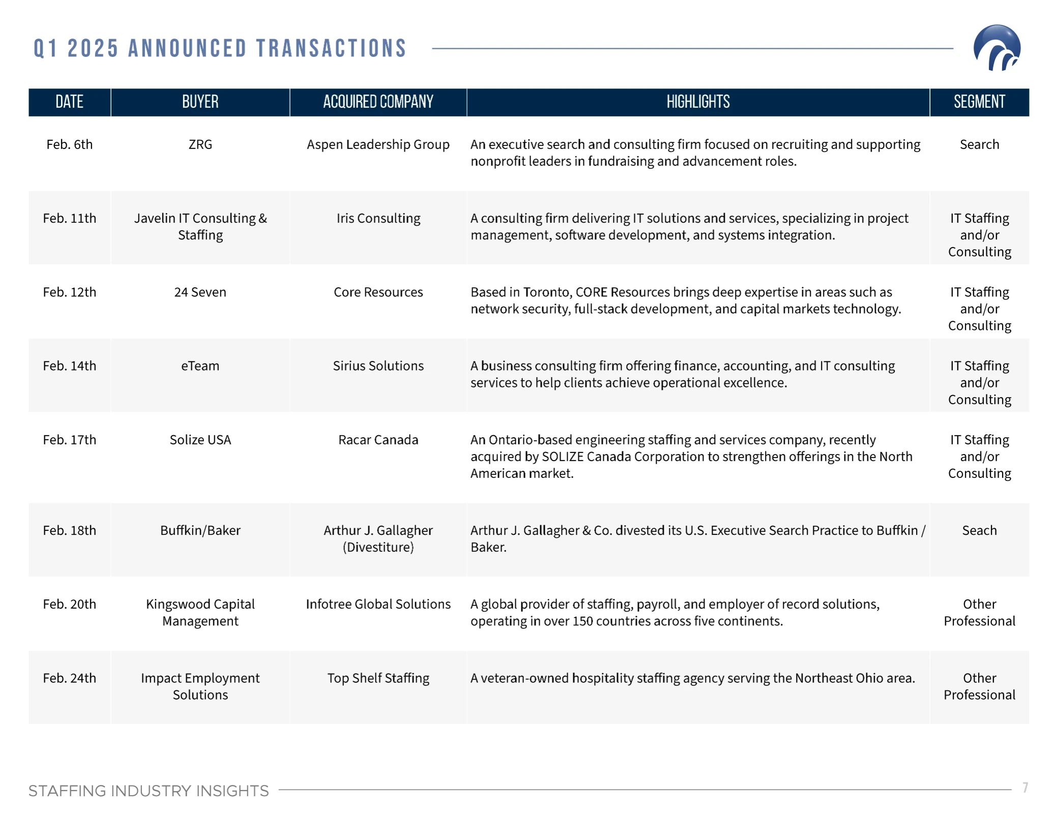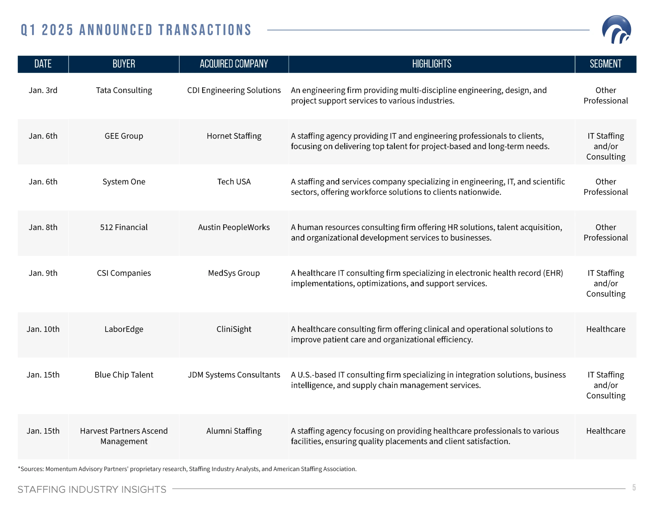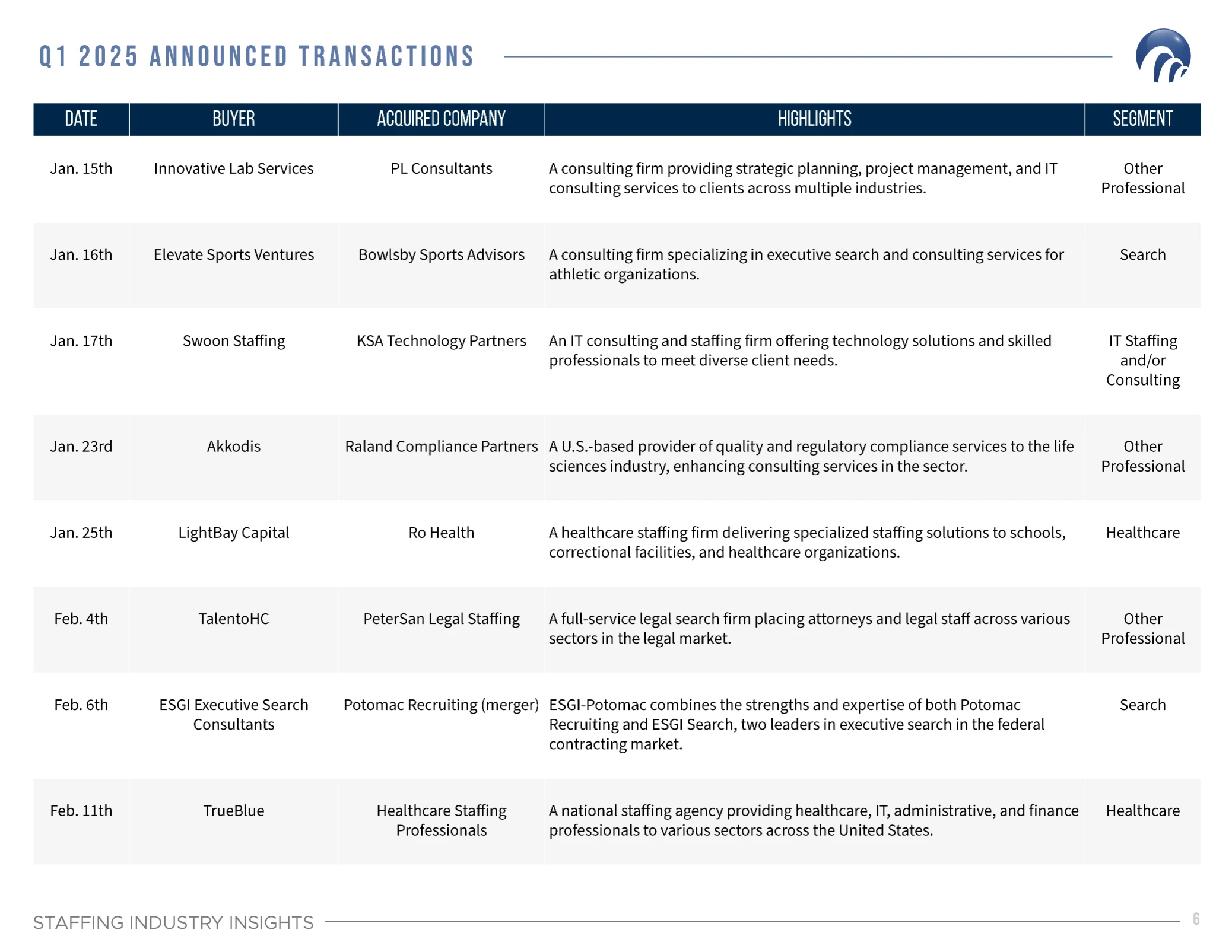 - After a period dominated by smaller add-ons, Q1 featured several larger, strategic transactions, including deals by Akkodis, ASGN, and TrueBlue, all covered in greater detail later in this report.